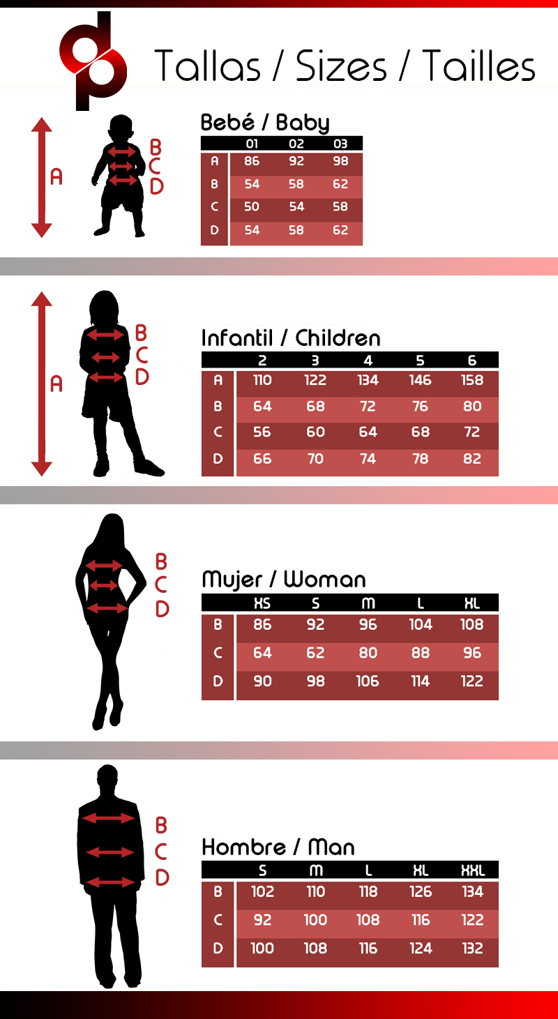 Las tallas de los niños van clasificadas por edades y medidas, y las de los adultos por medidas. En muchos disfraces veras "talla única" ya que algunos disfraces solo se fabrican en una talla única para adultos.